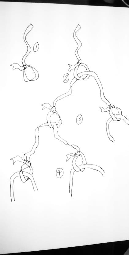 Preparation beforehand: Prepare lots of lengths (c.12-18 inches) of ribbon (or wool). One of them should be tied into a loop at one end, while all the others will need a loop at both ends.